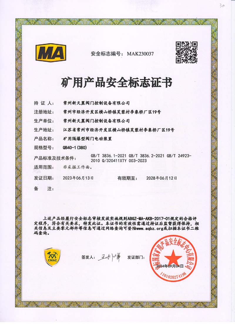 礦用產品安全標志證書QB30-1(380)